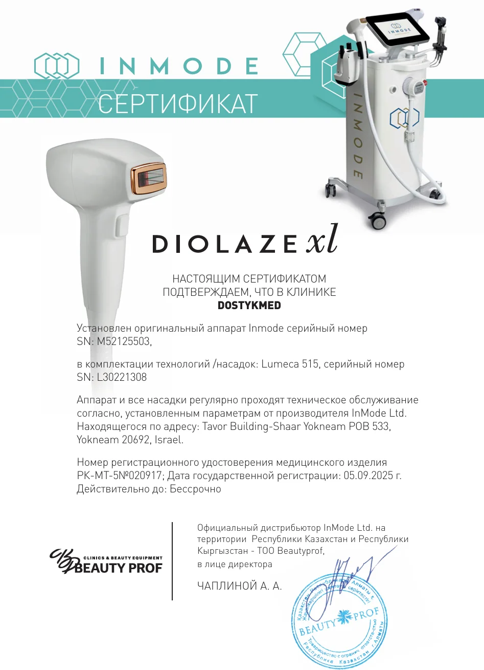 В работе мы используем только сертифицированные, разрешенные к применению на территории Республики Казахстан, препараты, а также в нашей клинике представлены только оригинальные аппараты, имеющие паспорт качества и лицензию.