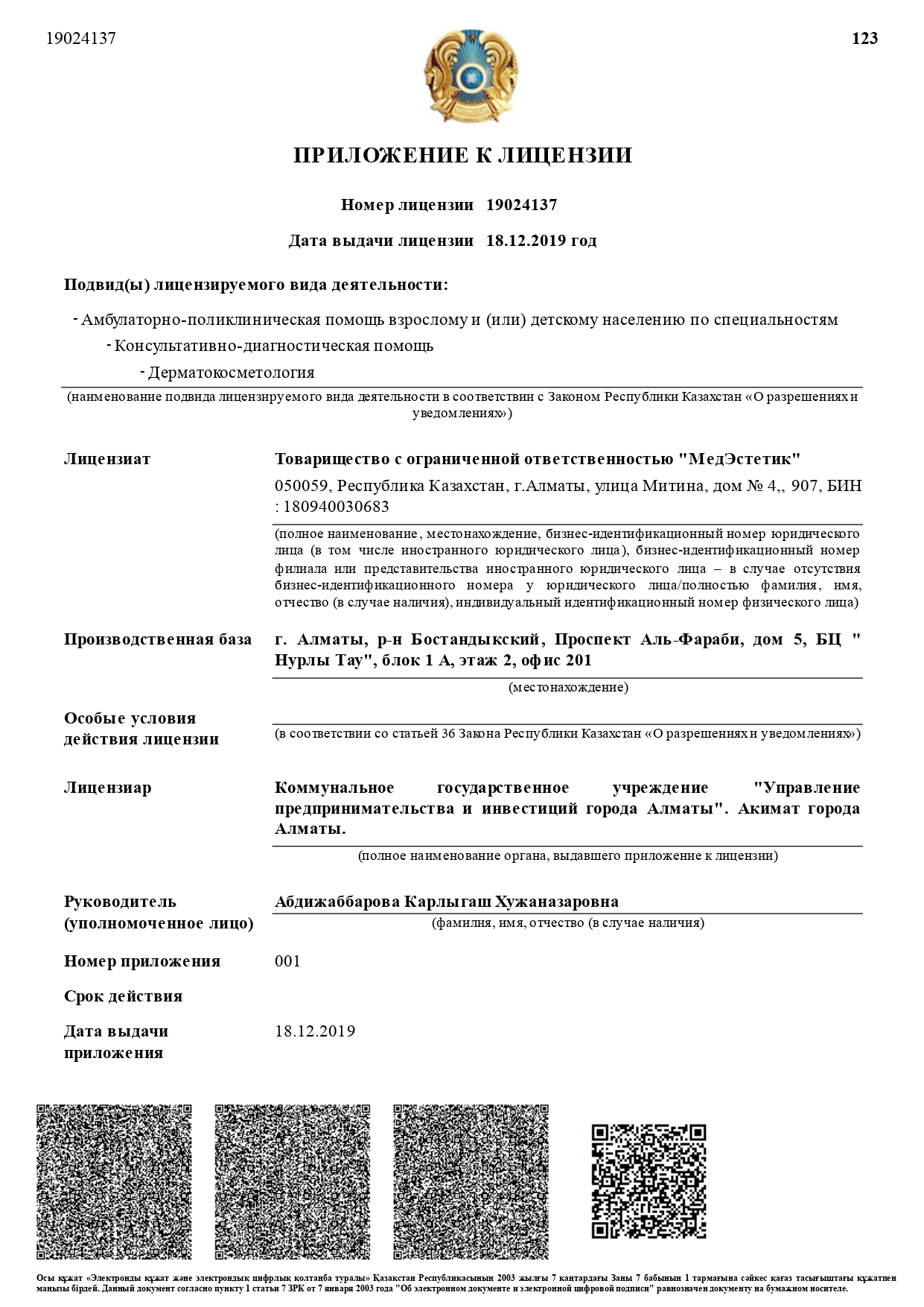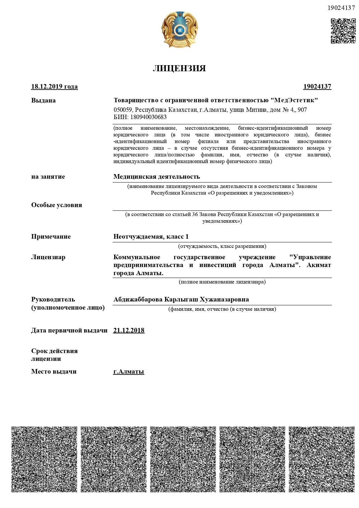 Лицензия на занятие медицинской деятельностью №19024137 от 18.12.2019 года