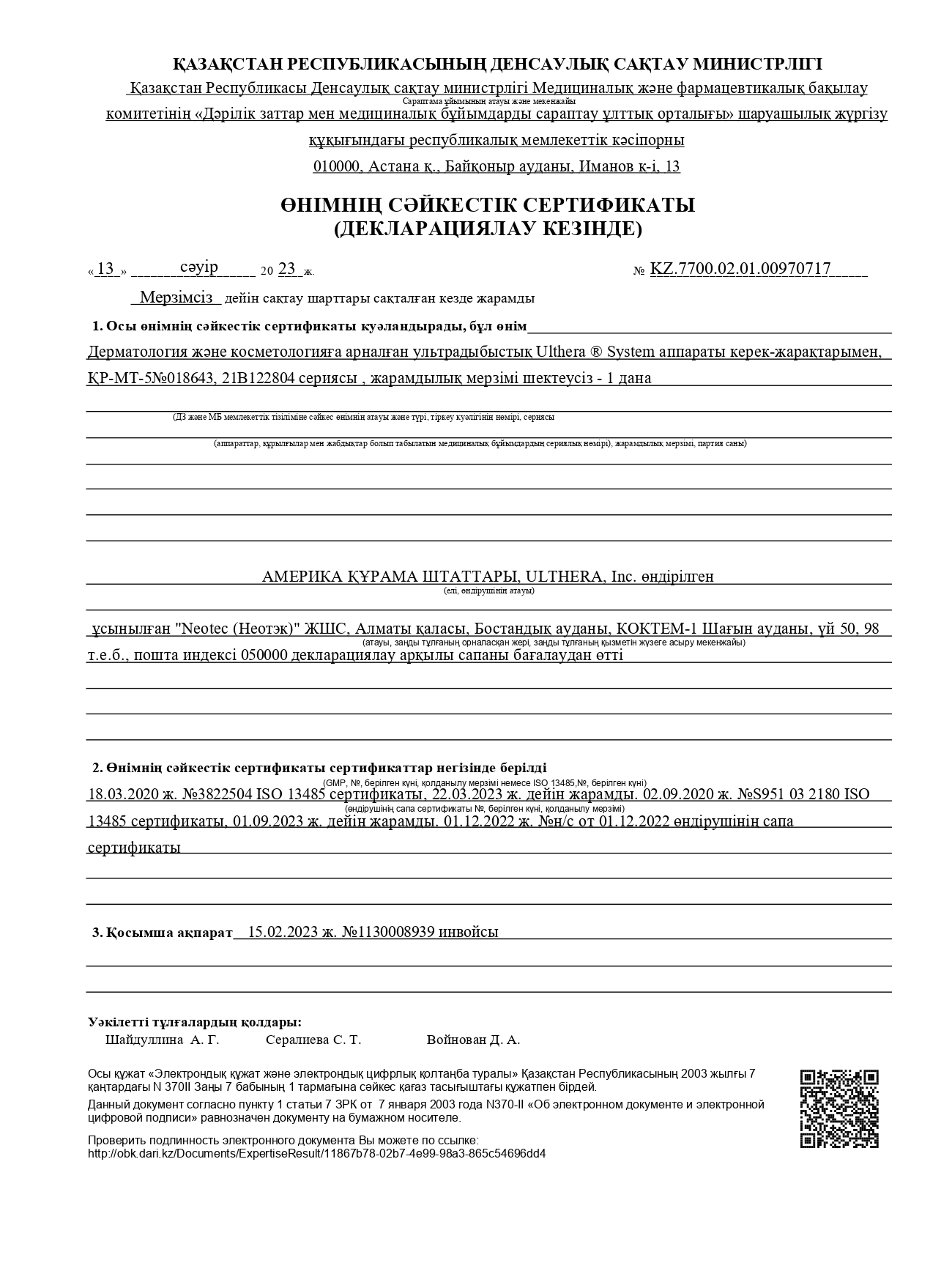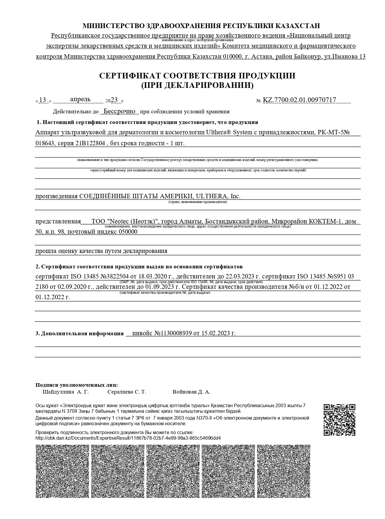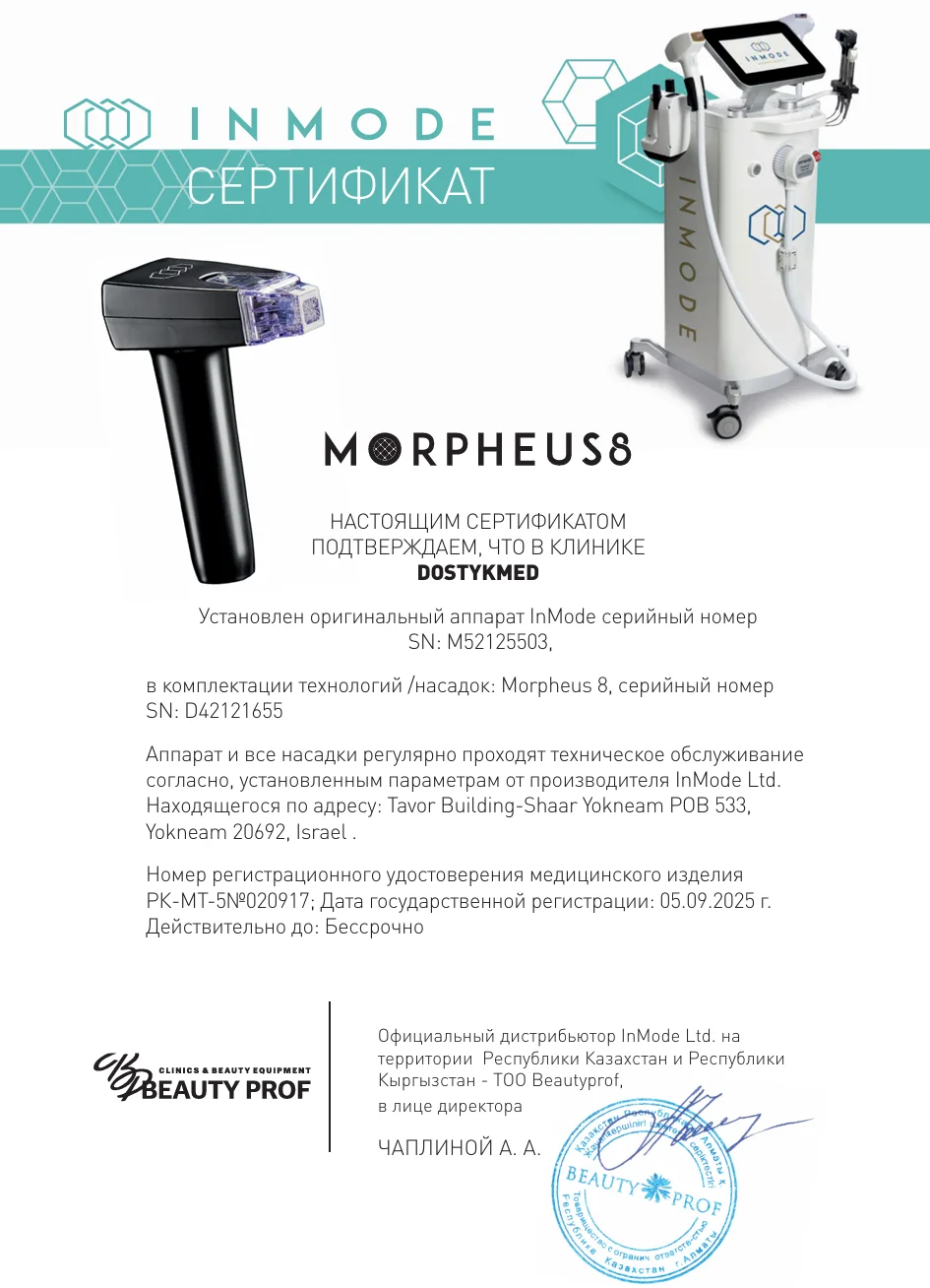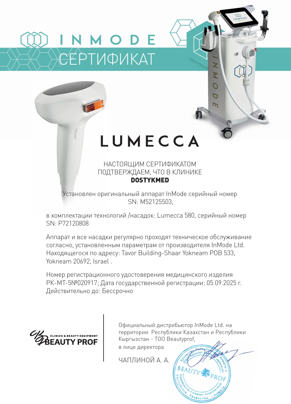 В работе мы используем только сертифицированные, разрешенные к применению на территории Республики Казахстан, препараты, а также в нашей клинике представлены только оригинальные аппараты, имеющие паспорт качества и лицензию.